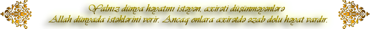 100 yaşında ölür, ona da ağlayırlar. Qardaş, nə istəyirsiniz, onu sizmi yaratdınız? Allah yaratdı. O, verdi, O da aldı. Niyə dərd çəkib ağlayırsınız? Cənnətə gedibsə, sevin. Dünyada qalıb nə edəcək? Cənnət heç dünya ilə müqayisə edilərmi?